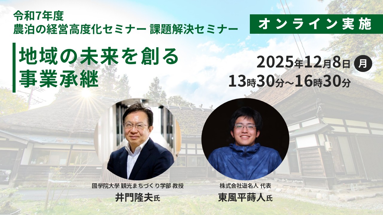 一般社団法人全国農協観光協会では、農泊地域の経営高度化に向けた連続セミナーの第9回として、「事業承継」をテーマに実施します。