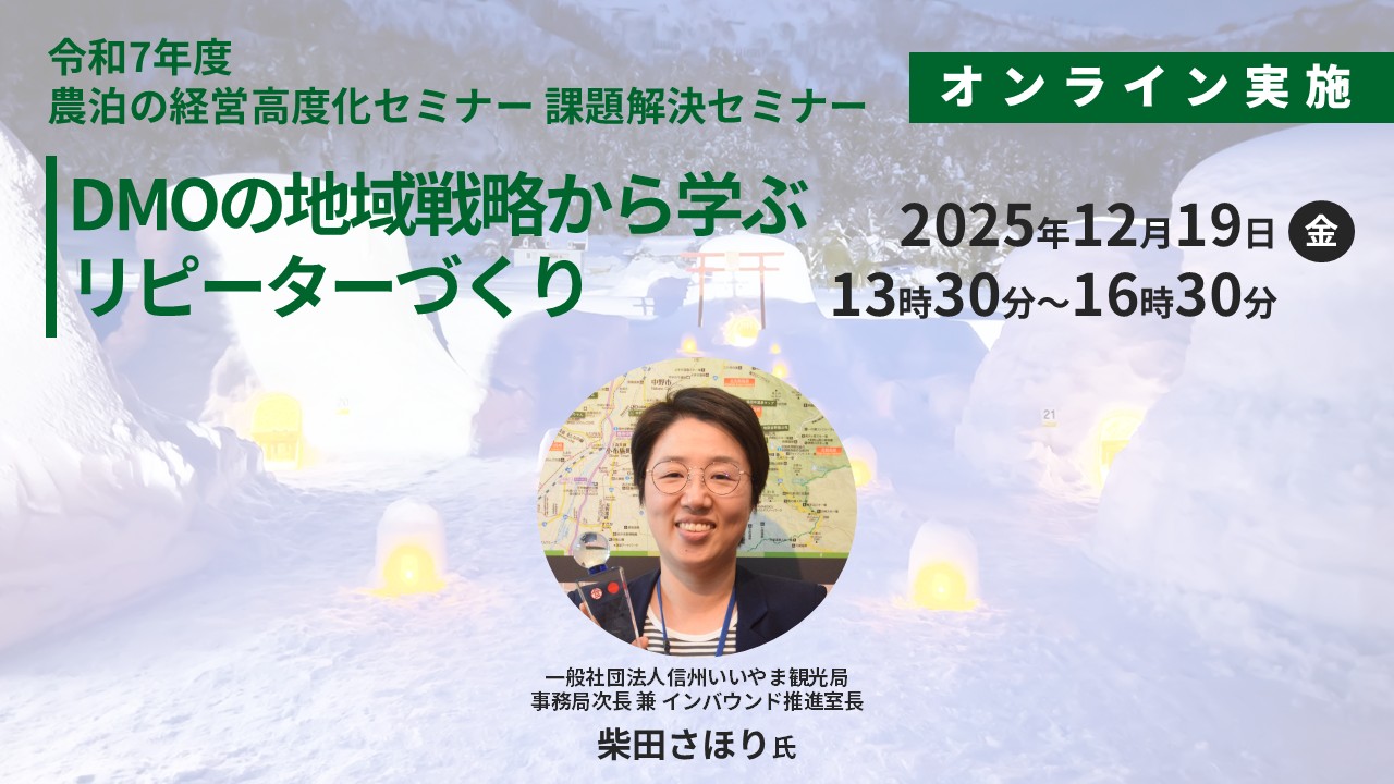 一般社団法人全国農協観光協会では、農泊地域の経営高度化に向けた連続セミナーの第10回として、「リピーターづくり」をテーマに実施します。